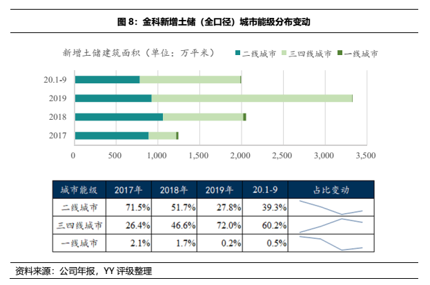 城市能級方面,公司過去拿地以二線為主,但近年來三四線城市拿地占比更高。公司在2016年年報中對拿地策略描述為“二線熱點城市為主,一線和中心三線城市為輔,逐步退出四線城市”,2019年年報調(diào)整為“以二三線城市為主,一四線城市為輔”,但仍為針對經(jīng)濟圈和城市群進行布局。整理近三年一期公司拿地分布情況,可見公司在二線城市新增建筑面積較為穩(wěn)定,同時在三四線城市拿地面積逐年增加,2019年新增土儲中,三四線城市占比達到72%,金科在擴張中選擇了加大城市下沉,從銷售規(guī)模強勢增速來看公司的確收割到了這波三四線去庫存、棚改的紅利。