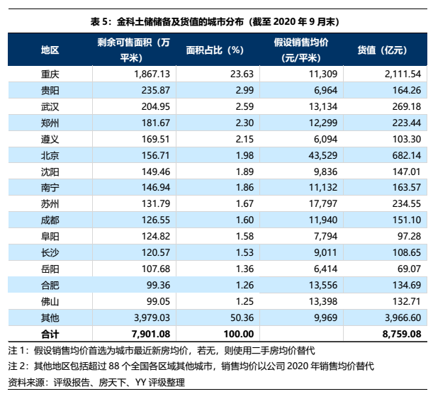 截至2020年9月末,金科土地儲備剩余可售建筑面積(全口徑)約7,902萬平方米,口徑為在建未售面積、竣工未售面積和待開發(fā)面積之和,土儲較實,按公司2020年2,240萬平方米的銷售建面估算,可供未來3年半銷售。我們結(jié)合各城市近期新房均價和公司2020年銷售均價進行估算,對應(yīng)貨值約8,759.08億元,充裕的土儲是公司逆勢擴張的底氣。
