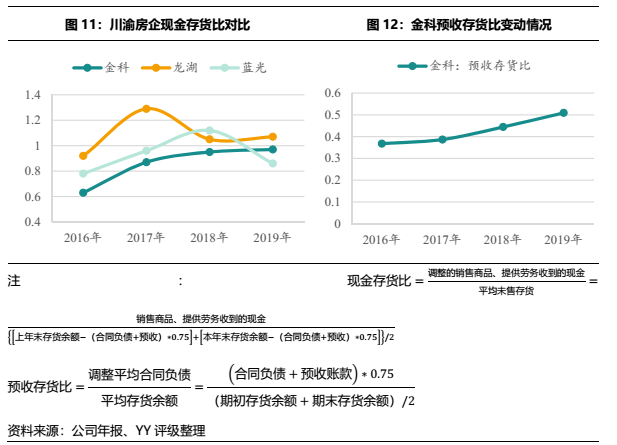 為了沖規(guī)模,金科采取了“1671”高周轉(zhuǎn)模式,即要求拿地后1個月開工、6個月開盤、7個月開發(fā)貸上賬、1年內(nèi)現(xiàn)金流回正。從周轉(zhuǎn)指標來看,公司近年預(yù)收存貨比和現(xiàn)金存貨比均持續(xù)上升,2019年現(xiàn)金存貨比在50強房企中排名15,存貨經(jīng)周轉(zhuǎn)形成現(xiàn)金流入速度居前,在川渝房企中僅次于排名11的龍湖,整體周轉(zhuǎn)較快。