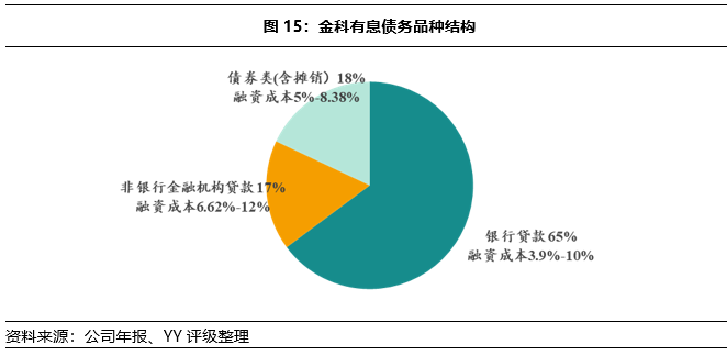 品種方面,公司以間接融資為主,其中銀行貸款占比65%,非銀貸款占比17%;債券類融資占比約18%。整體融資成本在3.9%-12%區(qū)間內(nèi),成本偏高。