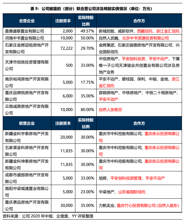 合聯(lián)營公司方面,對合作方進行排查,雖然大部分為與房企進行合作開發(fā),但也可見信托、投資公司身影,明股實債嫌疑較大,故將2020年6月末公司對除按揭擔(dān)保以外的對外擔(dān)保余額(不含對子公司)131.58億元計入表外債務(wù)。
