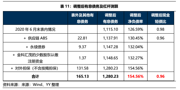 由此,可重新計算表內(nèi)表外綜合凈負債率為154.56%,現(xiàn)金短債比為0.96,公司實質(zhì)債務(wù)負擔(dān)更重。