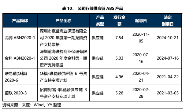 截至2020年6月末,金科擁有存續(xù)永續(xù)債券9.37億元。此外,目前還擁有以下存續(xù)供應(yīng)鏈ABS(可能不全),合計22.81億元,其是經(jīng)營性負債的形式,但實質(zhì)也是有息債務(wù),其中一年內(nèi)到期10.24億元,金額不高,公司表外主要風(fēng)險主要在非并表項目的或有負債敞口上。