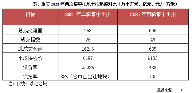和首輪集中土拍的火熱相比,重慶第二輪集中土拍可謂降至“冰點(diǎn)”。本輪集中土拍重慶掛出42宗涉宅,9宗提前中止出讓,余下的33宗地中有5宗流拍,僅成交28宗,流拍率(含中止出讓地塊)高達(dá)33%,與首輪零流拍的情況形成鮮明對(duì)比。