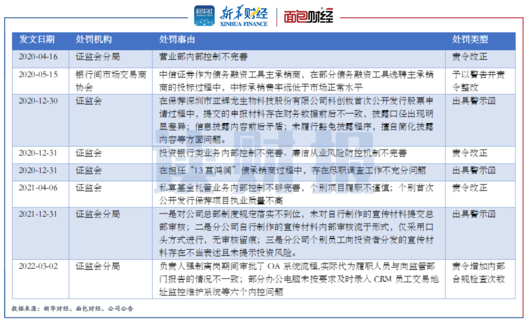 此外,2020年以來(lái),“行業(yè)一哥”中信證券也多次受到來(lái)自證監(jiān)會(huì)及其分局和銀行間市場(chǎng)交易商協(xié)會(huì)的監(jiān)管處罰。