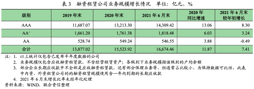 2021年以來,受疫情反復(fù)的影響,為了保持市場穩(wěn)定,資本市場資金面整體較為寬裕。從樣本公司經(jīng)營情況來看,2021年上半年,AAA級別[4]融資租賃公司業(yè)務(wù)規(guī)模較年初增長較快,主要系部分資質(zhì)較好的企業(yè)負(fù)債端再融資壓力相對較小,因此其在資產(chǎn)端能夠持續(xù)擴(kuò)大投放規(guī)模所致;AA+、AA級別融資租賃公司業(yè)務(wù)規(guī)模增速顯著低于AAA級別融資租賃公司,主要系行業(yè)內(nèi)部競爭加劇,實(shí)力偏弱的融資租賃公司面臨更大的壓力,需要注意的是,AA級別融資租賃公司業(yè)務(wù)規(guī)模較年初已經(jīng)出現(xiàn)小幅下滑的情況,未來需要對低評級公司的業(yè)務(wù)發(fā)展趨勢保持關(guān)注。另外,樣本內(nèi)能夠獲取到完整數(shù)據(jù)的融資租賃公司以中高級別居多,該部分企業(yè)通常資質(zhì)較好,受到外部融資環(huán)境結(jié)構(gòu)性緊張的影響相對較小,因此本文中樣本統(tǒng)計(jì)數(shù)據(jù)會與行業(yè)實(shí)際平均水平有一定的偏差。