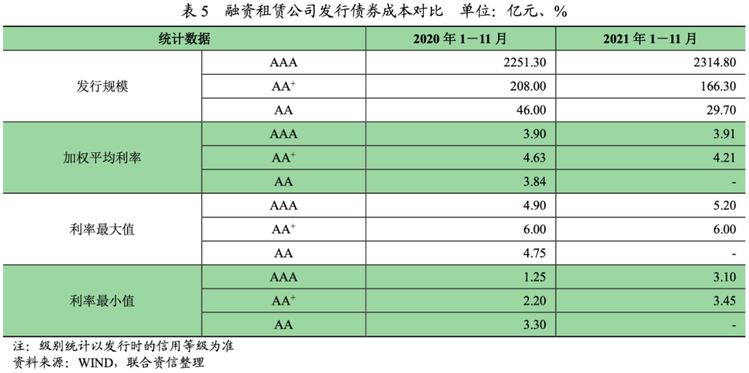 2021年,AA+級別融資租賃公司發(fā)行債券和資產(chǎn)證券化產(chǎn)品成本均較上年同期下降,與AAA級別利差較上年同期有所收縮;融資租賃公司股東背景和股東支持的認(rèn)可度對其債券發(fā)行成本有較大的影響,融資租賃公司融資端分化情況仍然存在。
