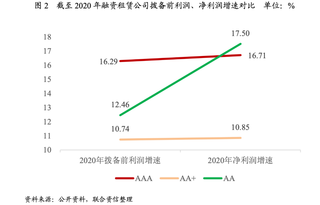 2020年,樣本融資租賃公司盈利規(guī)模有所增長,AAA級別融資租賃公司平均撥備前利潤增速最快,但是,AA級別融資租賃公司的平均凈利潤增長最快。2021年上半年,各級別樣本公司融資租賃公司凈利潤均實(shí)現(xiàn)增長,但是分化明顯。