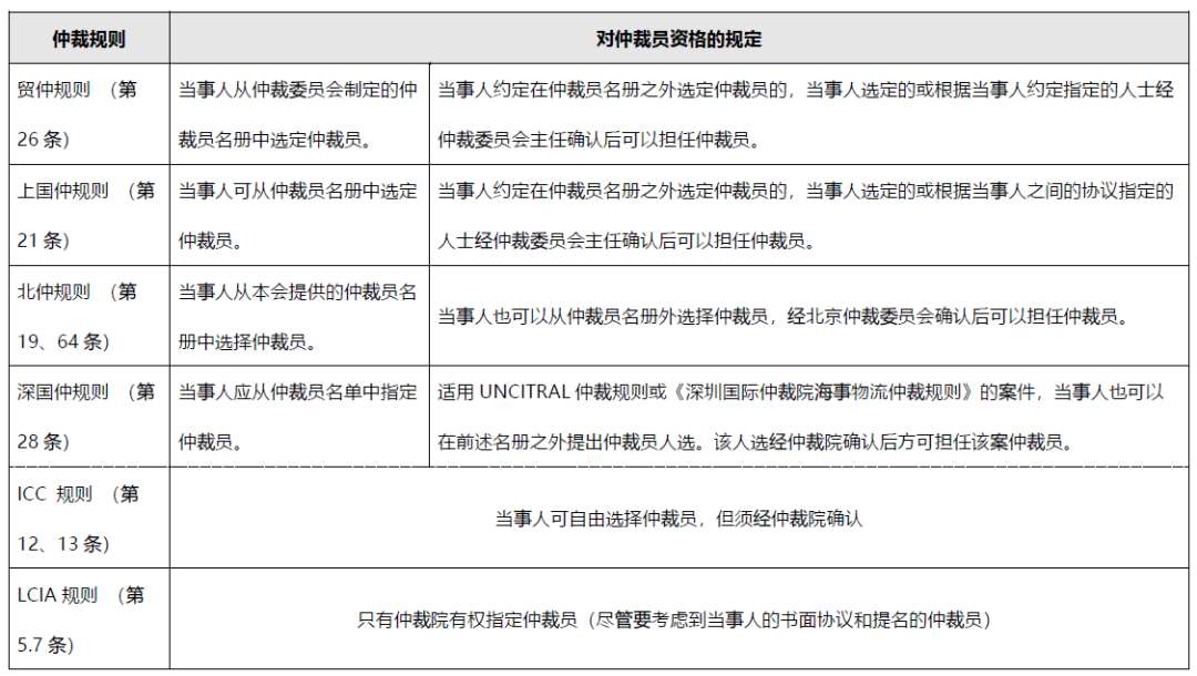一般而言,主流的國內外仲裁機構未從仲裁員的背景角度規定對其資格的要求,尤其是國際仲裁機構,對于仲裁員的資格基本僅有形式上的確認。部分國內仲裁機構可能規定當事人應從機構的仲裁員名冊/名單中選擇仲裁員,但即使是這部分仲裁機構一般也會允許當事人選擇名單外的其他仲裁員,名單外的仲裁員經仲裁機構確認后也可以擔任仲裁員。