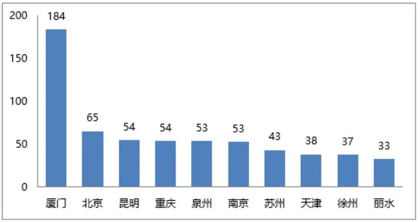 從城市分布來看,二線城市中以廈門、昆明及重慶的合同銷售表現(xiàn)最為突出,分別約184億元、54億元及54億元