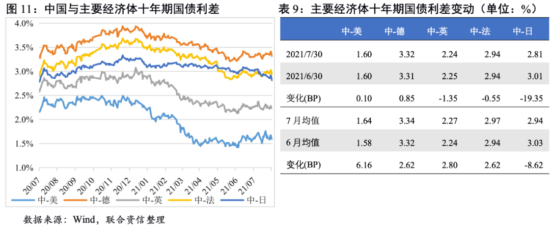 7月,主要經濟體的十年期國債收益率均出現下行,主要是受疫情反彈、避險情緒上升等因素影響;從利差均值看,7月除日本外,我國與其他主要經濟體的利差較6月均進一步走闊。其中,日本國債收益率受“日本央行宣布將購買季度債券來替代之前的月度債券,并分3個階段下調7月份日本國債購買頻率”導致貨幣政策收緊預期,下行幅度較小;其他主要經濟體的疫情較中國更嚴重,避險情緒更盛,國債收益率下行幅度均大于中國。因此導致我國與日本利差有所收窄,與其他主要經濟體利差有所擴大。