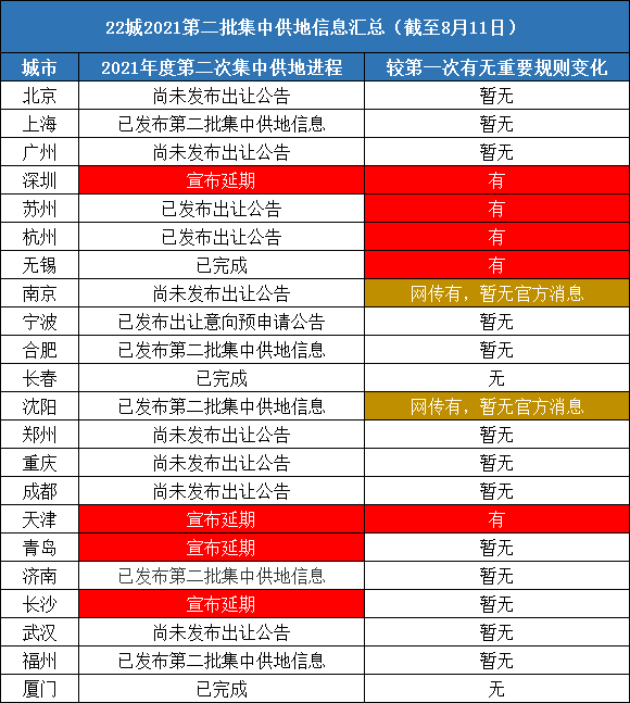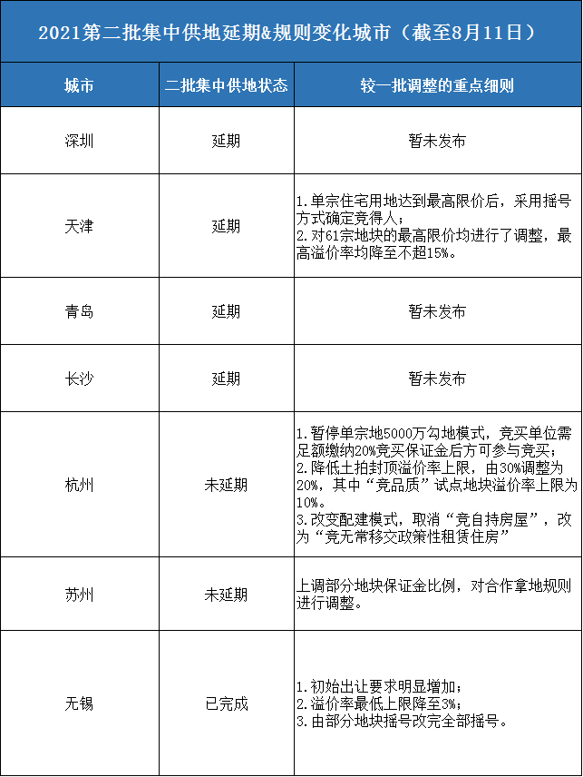 “補丁”來的很迅速。在22城2021年第一批推地全部完成,很多城市第二批箭在弦上的時間節點上,8月11日,自然資源部召開閉門會議,明確二批次核心城市土地出讓政策調整。在會議召開前后,一些熱點城市地方政府也紛紛開始跟進,或宣布第二輪供地延期,打磨政策“補丁”,或直接推出調整方案。