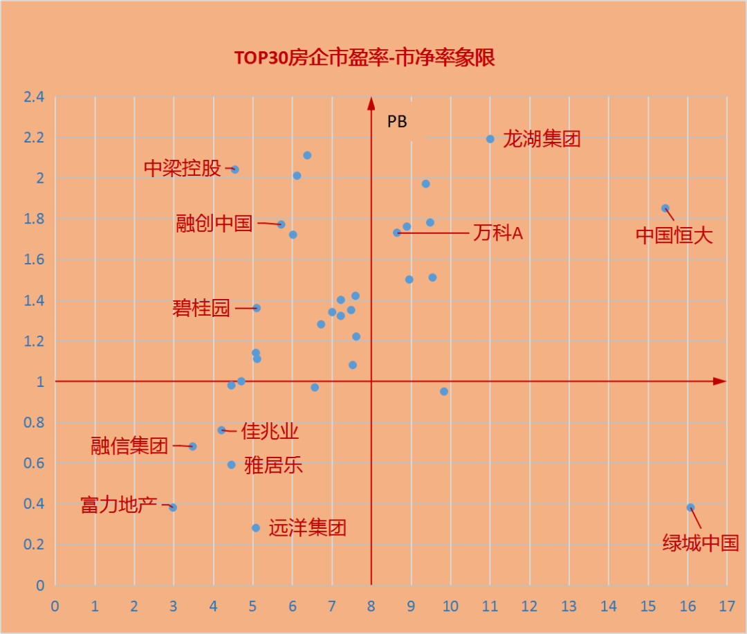 以市凈率1.0、市盈率8.0為坐標(biāo)原點(diǎn)。對TOP30房企進(jìn)行分類。