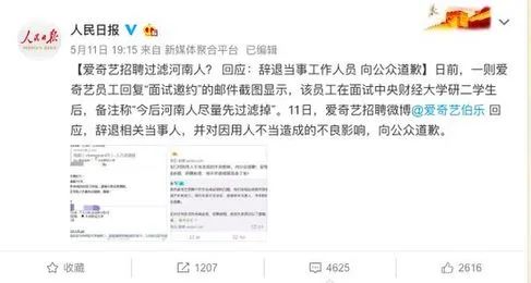 17年5月,愛奇藝被爆出在招聘中地域歧視。被爆出的郵件顯示,愛奇藝一位工作人員在面試了中央財經大學一名學生后,給在人力資源部回復中備注“今后河南人盡量先過濾掉,謝謝!