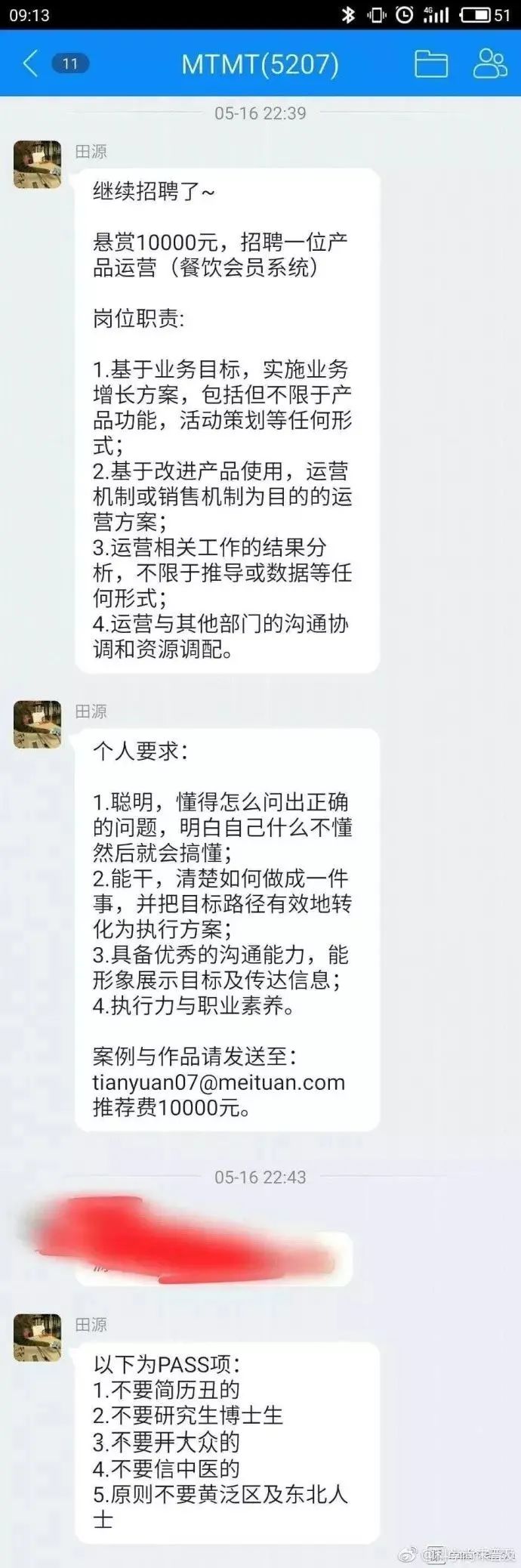 2017年5月,美團內部的一則招聘截圖流出,截圖顯示,一位名叫田某的小領導要招一個運營,提出了他的5個不要:不要簡歷丑的;不要研究生博士生;不要開大眾的;不要信中醫的;原則上不要黃泛區和東北人。消息雖然是發在公司內網,但截圖很快流出,引起口誅筆伐,為美團帶來海量的負面報道。