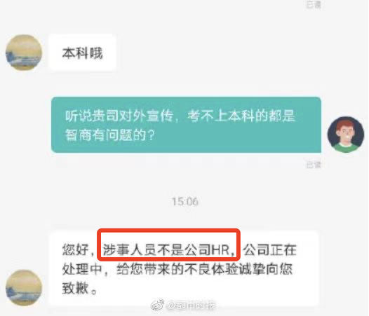 今年4月,杭州某企業招聘人員在招聘網站應聘者溝通時,表示“考不上本科的都是智商有問題的”,由此掀起網友口誅筆伐的熱議,該公司也因此“出名”。