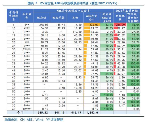 銷售端下行,再融資未接,到期壓力如影隨形,年關下的民營房企仍在暗夜中穿行。近期YY評級地產組盤點了14家民營房企短期兌付壓力。本篇,我們將視角聚焦于ABS這一融資品種,并將統計范圍擴大至銷售額前50中YY評級在5及以下的25家民營房企,整理其存量、類別及行權到期情況。