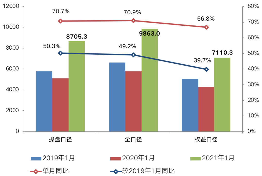 受去年同期正值春節(jié)假日,疊加新冠疫情的爆發(fā)、市場(chǎng)全面停擺影響,整體成交基數(shù)較低,2021年1月百?gòu)?qiáng)房企銷售數(shù)據(jù)在去年基數(shù)較低的基礎(chǔ)上出現(xiàn)強(qiáng)勢(shì)反彈,整體業(yè)績(jī)規(guī)模較去年同期大幅上升70.7%,較2019年同期增長(zhǎng)50.3%。