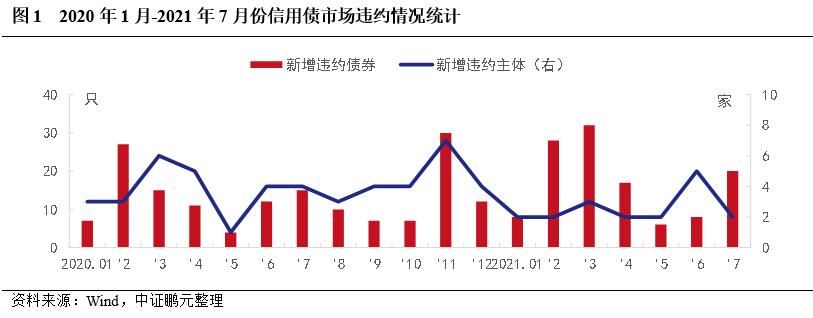 7月首次違約債券20只,違約數(shù)量出現(xiàn)明顯增長(zhǎng),主要是因?yàn)樗{(lán)光發(fā)展的風(fēng)險(xiǎn)顯露,存續(xù)債券陸續(xù)違約,7月首次違約債券涉及6家發(fā)行人。從違約類(lèi)型看,本月新增違約債券除藍(lán)光發(fā)展的4只債券為交叉違約,其余均為實(shí)質(zhì)性違約。從違約事件看,6只為本金利息項(xiàng)違約,1只涉及回售款項(xiàng)違約,3只因破產(chǎn)觸發(fā)其到期,4只為交叉違約,6只為加速清償。從債券類(lèi)型看,公司債9只,中期票據(jù)5只,定向工具3只,私募債2只,短期融資券1只。從企業(yè)性質(zhì)看,2家新增違約主體均為民營(yíng)企業(yè)。從上市情況看,本月新增違約主體均為上市公司。從處置方式看,3只債券發(fā)行人與持有人達(dá)成展期兌付協(xié)議,其他債券均未公布兌付方案。