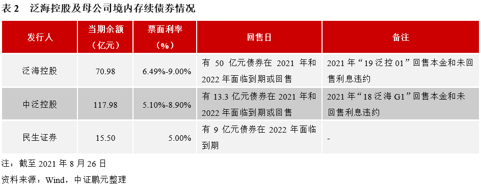第五,受政策影響,民生系對(duì)泛海系支持能力下降。長(zhǎng)期以來(lái),民生系是泛海系重要的資金支持方,截至2020年末,泛海系在民生銀行的貸款余額超200億元。但受監(jiān)管政策和信用風(fēng)險(xiǎn)事件影響,民生系對(duì)泛海系的支持力度有所弱化,其中,2021年7月公司控股股東中泛控股持有的民生銀行股份因債務(wù)糾紛被司法凍結(jié)和拍賣(mài),但隨后與債權(quán)人達(dá)成協(xié)議,撤銷(xiāo)上述拍賣(mài)。中泛控股及其關(guān)聯(lián)方持有民生銀行可行使表決權(quán)的股份數(shù)合計(jì)約30.40億股,占該行總股本的6.94%,其中87.09%已被質(zhì)押,此次遭司法凍結(jié)并拍賣(mài)的股份占其持有股份比例為12.79%。此外,根據(jù)公開(kāi)信息,民生信托、民生財(cái)富投資管理有限公司和泛海投資集團(tuán)有限公司基金類(lèi)資金池產(chǎn)品基本已全線延期兌付,規(guī)模超過(guò)300億元。
