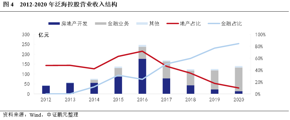 目前,泛海控股房地產(chǎn)業(yè)務(wù)以住宅產(chǎn)品為主,項(xiàng)目集中在武漢和美國(guó),金融業(yè)務(wù)主要運(yùn)營(yíng)主體為民生證券股份有限公司(簡(jiǎn)稱(chēng)“民生證券”)、中國(guó)民生信托有限公司(簡(jiǎn)稱(chēng)“民生信托”)、亞太財(cái)產(chǎn)保險(xiǎn)有限公司(簡(jiǎn)稱(chēng)“亞太財(cái)險(xiǎn)”)和中國(guó)通海國(guó)際金融有限公司(0952.HK,簡(jiǎn)稱(chēng)“中國(guó)通海金融”)。房地產(chǎn)板塊受存量項(xiàng)目減少、金融業(yè)務(wù)增加的影響,收入占比自2016年來(lái)呈現(xiàn)明顯下降,于此同時(shí),金融板塊收入占比逐年增加。截至2020年底,地產(chǎn)板塊業(yè)務(wù)收入占比18%,金融板塊占比77%,收入結(jié)構(gòu)完成調(diào)整。2020年1月,經(jīng)證監(jiān)會(huì)核準(zhǔn),公司行業(yè)分類(lèi)由“房地產(chǎn)”正式變更為“金融業(yè)”的子行業(yè)“其他金融業(yè)”。