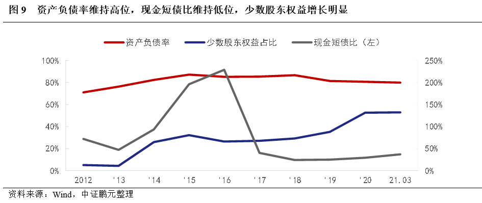 地產(chǎn)和金融不分家的邏輯,在泛海系中延伸。隨著收購(gòu)的推進(jìn),泛海系打造了民生系金融家族,并在其中占有主導(dǎo)地位。轉(zhuǎn)型完成了第一階段的業(yè)務(wù)布局,進(jìn)入第二階段的現(xiàn)金流綜合管理,逐步出現(xiàn)轉(zhuǎn)型中的“陣痛”。第一,地產(chǎn)板塊停止擴(kuò)張,但存續(xù)項(xiàng)目后續(xù)投資規(guī)模較大。公司地產(chǎn)板塊土地資產(chǎn)主要為2016年之前獲得,此后以釋放存量土地價(jià)值為主。隨著地產(chǎn)項(xiàng)目建設(shè)投資的推進(jìn),存貨規(guī)模大幅增長(zhǎng),在資產(chǎn)中占比逐年增加,截至2018年3月,存貨占比63%,在建項(xiàng)目計(jì)劃總投資821.78億元,尚需投資343.94億元,再融資壓力較大。第二,布局金融業(yè)務(wù),帶來(lái)金融資產(chǎn)增長(zhǎng)。通過(guò)收購(gòu)(增資)亞太財(cái)險(xiǎn)、民生期貨、民生證券和民生信托等板塊布局民生系,可供出售金融資產(chǎn)2015年、2016年出現(xiàn)大幅增長(zhǎng),交易性金融資產(chǎn)隨金融板塊業(yè)務(wù)的發(fā)展而增長(zhǎng),但業(yè)務(wù)受制于資管新規(guī)影響,金融業(yè)務(wù)板塊收入在2018年出現(xiàn)放緩,隨著2019年進(jìn)一步布局金融業(yè)以及市場(chǎng)回暖,金融相關(guān)資產(chǎn)占比大幅提升。其中,交易性金融資產(chǎn)主要為子公司民生證券自營(yíng)業(yè)務(wù)投資的證券,變現(xiàn)能力整體較好。第三,負(fù)債大幅增長(zhǎng),短期債務(wù)占比逐步提升,再融資壓力提升。受存量地產(chǎn)業(yè)務(wù)和金融業(yè)務(wù)擴(kuò)張需求影響,2012年后公司負(fù)債規(guī)模出現(xiàn)明顯增長(zhǎng),其中,2014-2016年受地產(chǎn)項(xiàng)目融資增長(zhǎng)影響長(zhǎng)期借款占比大幅提升,隨著債務(wù)逐步到期,2017年以來(lái)短期債務(wù)占比逐漸增加,同時(shí),公司長(zhǎng)期融資規(guī)模出現(xiàn)明顯下降,再融資壓力提升,面臨集中償付風(fēng)險(xiǎn)。