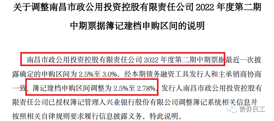 2、南昌市政公用投資控股有限責任公司2022年度第二期中期票據的申購區間由[2.5%-3.0%]調整為[2.5%-2.78%],即是將利率上限下調了22個BP。南昌市政公用投資控股有限責任公司的主體信用等級為AAA,實際控制人為南昌市國資委。