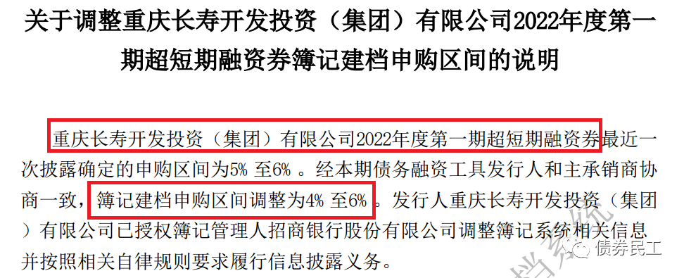 1、重慶長壽開發投資(集團)有限公司2022年度第一期超短期融資券的申購區間由5%-6%調整為4%-6%,即是將利率下限下調了100個BP。重慶長壽開發投資(集團)有限公司的主體信用等級為AA+,實際控制人為重慶市長壽區國資委。