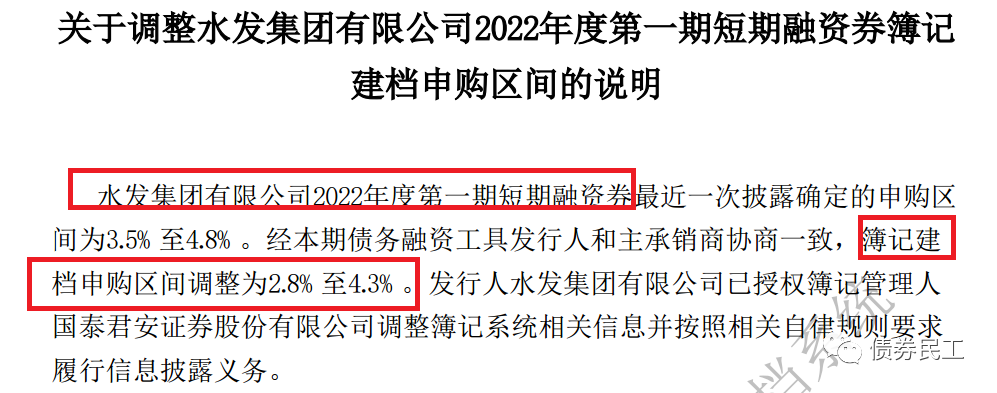 4、水發集團有限公司2022年度第一期短期融資券的申購區間由[3.5%-4.8%]調整至[2.8%-4.3%],即是將下限下調了70個BP,將上限下調了50個BP。水發集團有限公司的主體信用等級為AAA,實際控制人為山東省國資委。