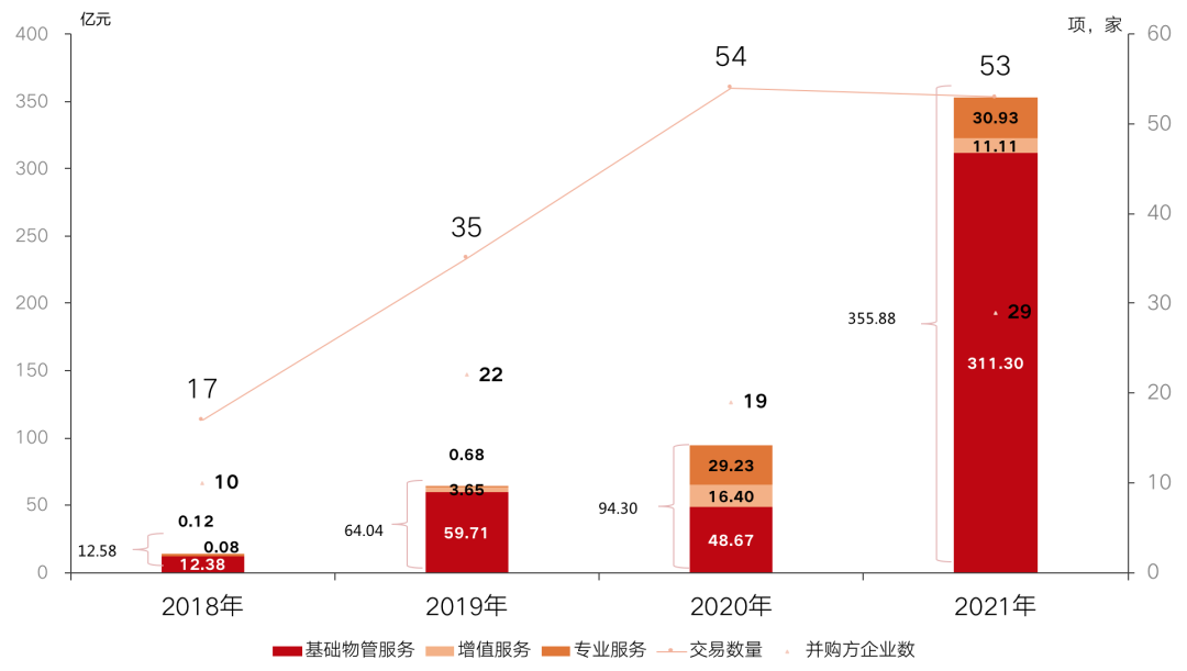 2021年,物業行業并購市場火熱,據克而瑞物管和中物研協數據,截至2021年12月31日,共有29家上市物企發起53項并購,并購交易總額達355.88億元。