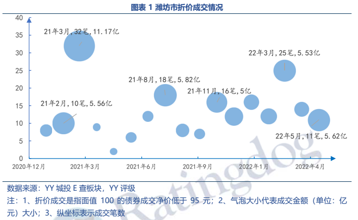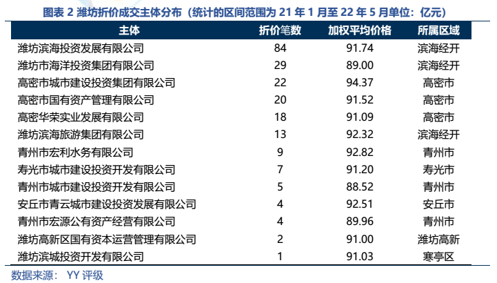 (1)從成交來看,濰坊折價成交頻繁(2022年5月共11筆折價,金額合計5.62億元),規模甚至高于湖南等省份全省,主要集中在濱海經開區和高密市。