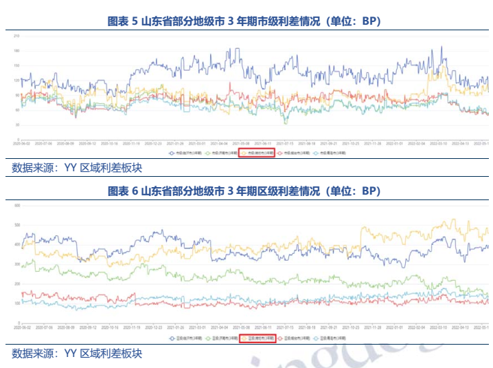 (3)從區域利差來看,濰坊區縣級平臺的市場認可度較弱,2022年5月末區級3年期利差高達469BP。