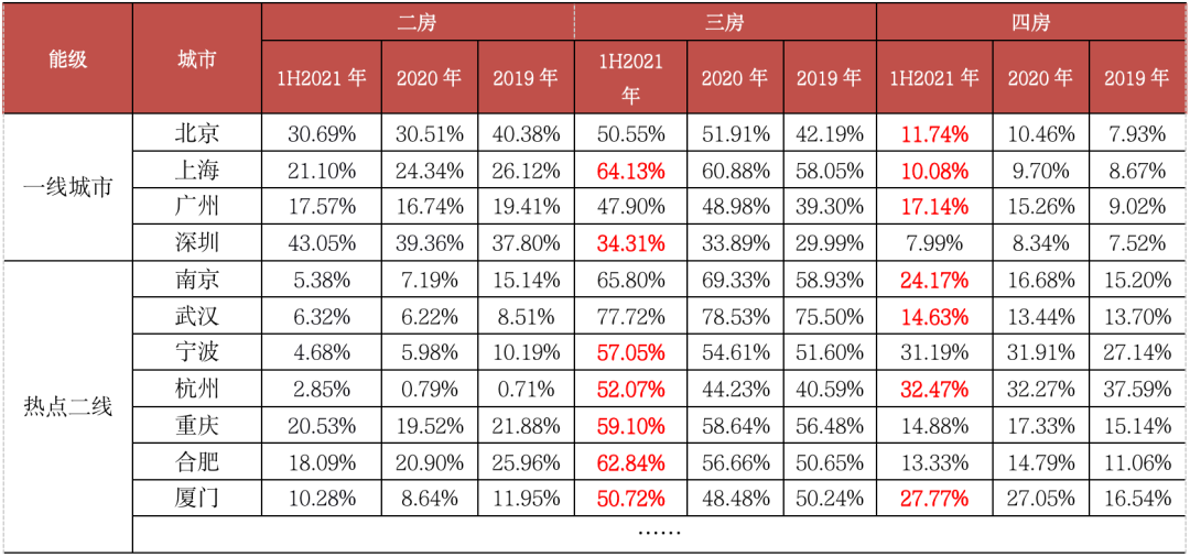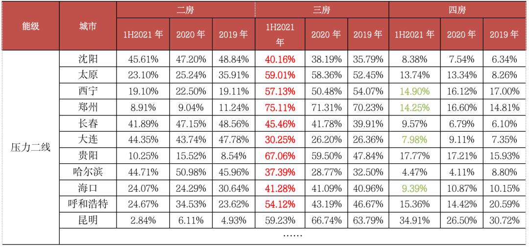 二線城市改善性需求堅挺,三房、四房成交比重仍保持較快增長。2021年上半年,二線城市三房戶型成交占比升至57.88%,較2020年再增1.33個PTS,四房戶型成交占比達到20.26%,較2020年再增1.49個PTS。