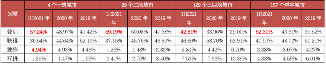 在這其中,一線城市疊加別墅最受市場歡迎,成交占比升至57.24%,較2020年增長8.27個PTS。聯排別墅銷售遇冷,成交占比降至36.54%,較2020年銳減8.1個PTS。