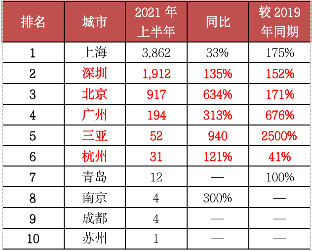 表:2021年上半年單價5萬元/平方米以上豪宅成交套數TOP20城市(單位:套)數據來源:CRIC中國房地產決策咨詢系統