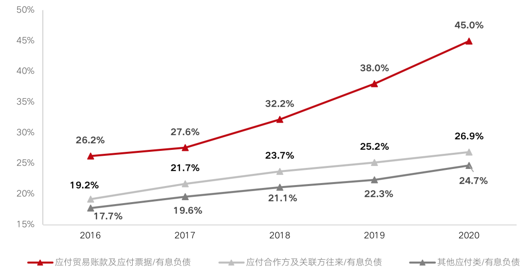 三項應(yīng)付類債務(wù)與有息債務(wù)的比例(單位:%)