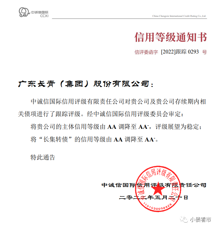 5月24日,中誠信國際公告稱,將長青集團(002616.SZ)主體信用等級由AA調降至AA-,評級展望為穩定,并將“長集轉債”的債項信用等級由AA調降至AA-。