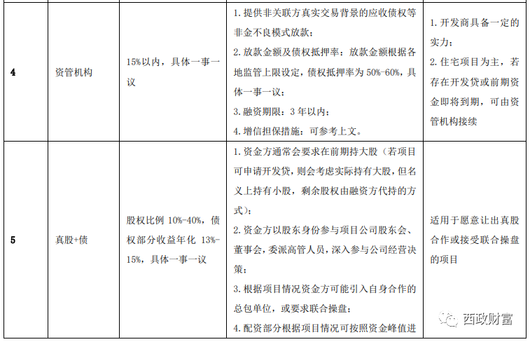 目前市面上能操作中小開發(fā)商融資業(yè)務(wù)的資金機(jī)構(gòu),除了前文提到的一些依托于開發(fā)商背景的資金機(jī)構(gòu)及大型的地產(chǎn)投資機(jī)構(gòu)外,還包括一些小貸機(jī)構(gòu)、三方財(cái)富公司及少部分私募基金、個(gè)人金主、少部分國(guó)央企背景的資金及資產(chǎn)管理機(jī)構(gòu)(非金不良模式)。其中小貸機(jī)構(gòu)的成本一般集中在年化16%-18%,三方財(cái)富公司及少部分私募基金因其資金受限于資金募集(當(dāng)前產(chǎn)品形式受限、私募等機(jī)構(gòu)頻繁爆雷增加了募集難度),其成本一般在年化18%-20%左右,個(gè)人金主的融資成本相對(duì)更高一些,但該類資金往往可以接受項(xiàng)目下沉到三四線城市。另外,依托于開發(fā)商背景的資金機(jī)構(gòu)、大型的地產(chǎn)投資機(jī)構(gòu)以及少部分國(guó)央企、資產(chǎn)管理機(jī)構(gòu)因?yàn)槠滟Y金主要是自有資金,其融資成本則相對(duì)低一些,普遍在年化15%左右,當(dāng)然對(duì)于優(yōu)質(zhì)的主體并提供前置抵押的情況下,融資成本可到年化12%-13%,或者更低。