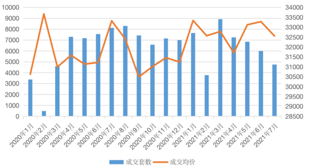 圖:2021年1月-2021年7月杭州二手住宅成交量價(單位:套、元/平方米)