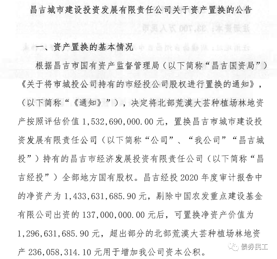 1、根據昌吉城市建設投資發展有限責任公司2021年9月23日發布的公告,擬將北部荒漠大蕓種植場林地資產用于置換公司的全資子公司昌吉市經濟發展投資有限責任公司的股權。根據公告內容,本次資產置換的主要目的是深化昌吉市的國有企業改革,調整優化國有資本布局。公司的控股股東是昌吉市國有資產投資經營有限責任公司,實際控制人是昌吉市國有資產監督管理局。公司的主體信用評級為AA,存續債券金額為14.80億元。