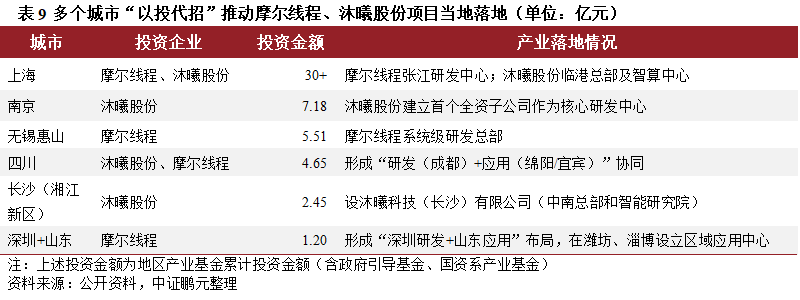 哪些城投/產投系產業基金精準押注摩爾線程、沐曦股份?城投/產投系產業基金主要通過直接投資、戰略配股、政府引導基金+子基金、跨區協同、多平臺協同、多層嵌套等方式參與摩爾線程、沐曦股份的投資。上海、南京浦口、無錫惠山、四川省、長沙湘江等區域城投/產投均有押注。上海、無錫等多地政府通過投資成功吸引摩爾線程設立分支機構,促進產業集群形成;上海、南京、長沙、成都、綿陽通過投資成功將沐曦股份引入本地,形成GPU產業集群。其中,南京浦口地區投資最早,其中政府引導基金和利國信智芯基金對沐曦股份的投資回報近66倍[4],南京浦口高科對沐曦股份的直接投資回報率約25倍[5],且成功將沐曦股份研發中心引入南京浦口;無錫惠山通過pre-IPO、戰略配股直接投資,成功將摩爾線程AI芯片及智算中心總部引入惠山。