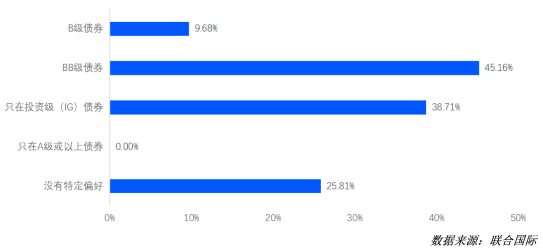 在未來12個(gè)月內(nèi),少于10%的受訪者會(huì)考慮投資B級(jí)債券。45.2%的受訪者考慮投資BB級(jí)債券,同時(shí)38.7%的受訪者只考慮投資級(jí)(IG)債券。有25.8%的受訪者在未來12個(gè)月內(nèi)沒有特定偏好(見附表2)。