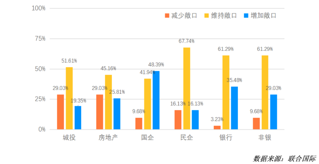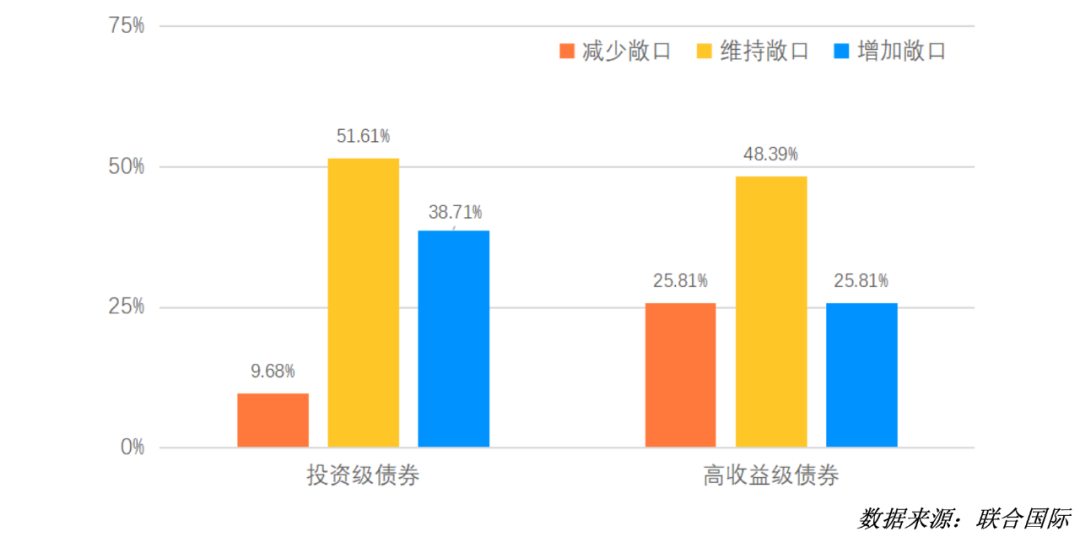對(duì)于投資級(jí)債券,大多數(shù)受訪者計(jì)劃維持對(duì)所有行業(yè)的敞口。只有少數(shù)受訪者計(jì)劃減少他們?cè)趪?guó)企、銀行和非銀的敞口。大多數(shù)受訪者計(jì)劃在未來12個(gè)月內(nèi)增加國(guó)企的敞口(見附表5)。
