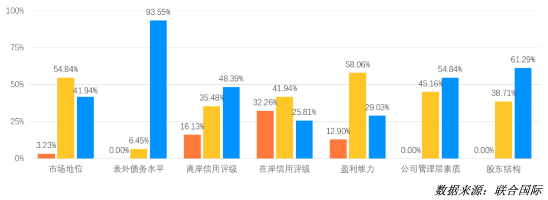 對(duì)于投資者在投資城投債券時(shí)會(huì)考慮的因素方面,大部分的受訪者最關(guān)注發(fā)行人的行政級(jí)別、業(yè)務(wù)性質(zhì)、政府政策、政府支持程度、當(dāng)?shù)卣呢?cái)政能力、當(dāng)?shù)氐臍v史違約事件、股東結(jié)構(gòu)和隱性債務(wù)規(guī)模。關(guān)于城投發(fā)行人的公司資產(chǎn)規(guī)模,約半數(shù)受訪者表示最為關(guān)注,約半數(shù)受訪者持一般態(tài)度。他們中許多人對(duì)離岸和在岸信用評(píng)級(jí)持中立態(tài)度(見附表11)。