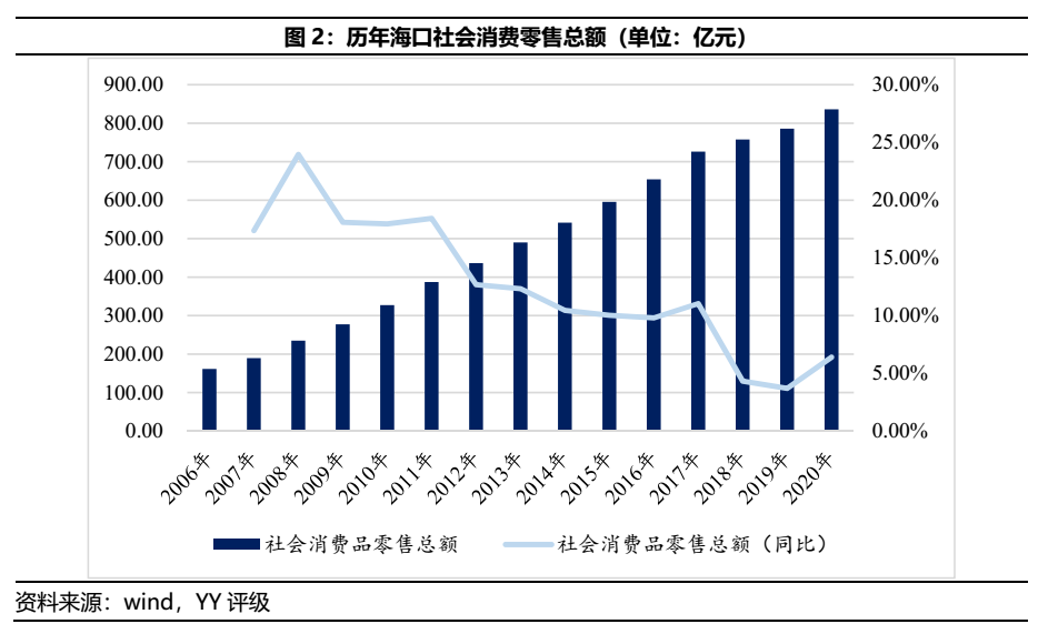 海口市社會消費零售總額近年未取得良好增長,近三年均落于7.5%之下,致使島內眾多商場分食的消費需求僅限于存量需求。
