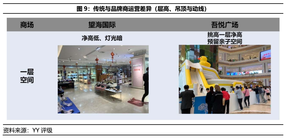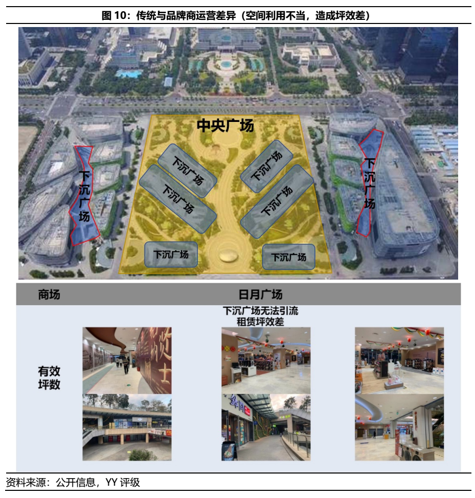 此外,如日月廣場的中央廣場看似打造了地上一層中央廣場和地下一層的下沉商鋪廣場,前者得以聚集人流,后者則供人流消費,但實則為海口當地氣候過熱,面積過大的中間廣場致使人流稀少(出現的人流往往是因為兩旁購物中心被切割,被迫走途經中央廣場),從而導致下沉廣場人煙稀少,店鋪空置率高。而這點也是導致圖6日月廣場與吾悅廣場比較分析上,前者的有效面積(可租賃面積/建筑面積)大于后者,但吾悅廣場的單方創收租金卻遠高于日月廣場的原因。