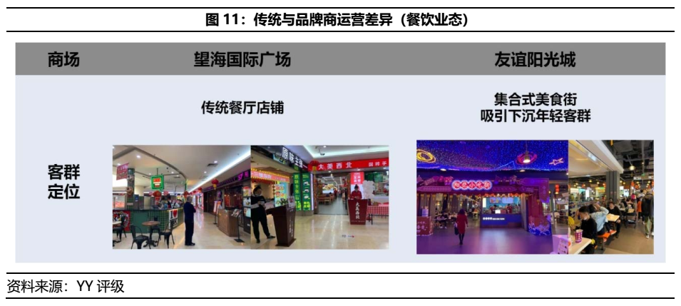 一般情況下,餐飲店鋪的坪效較低,多數高端商鋪不會配置太多餐飲業態商鋪。但由于三線城市的高端商品周轉率較低,以小吃商鋪短平快特色對餐飲商鋪進行大量招商,得以借助于周轉率的提升而獲益。如友誼陽光城購物商場的6-9層配置了大規模的夜市餐飲,使餐飲店鋪占比達到了39.38%;吾悅廣場的3-4層幾乎全部配置了餐飲店鋪,餐飲店鋪占比為37.42%。