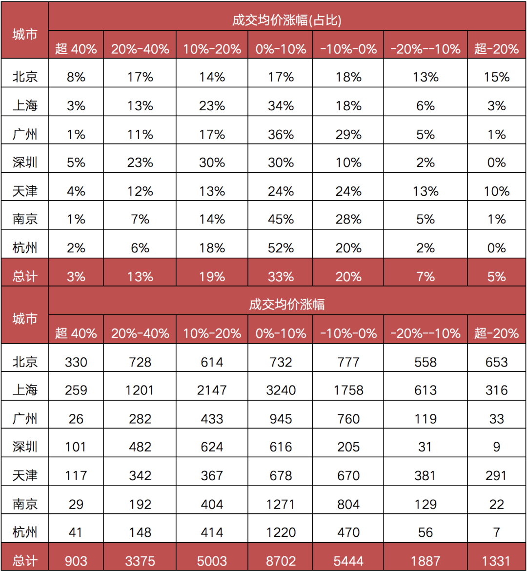與此同時,成交均價下跌的小區中,6成以上的小區跌幅不足10%。除北京、天津稍高外,上海、深圳、廣州等城市跌幅超10%的小區占比不足全市10%,因此市場直觀感受中在售項目罕有“跌勢”。