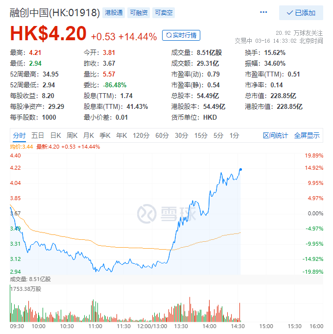 典型的如融創(chuàng)中國(guó),上午還下跌了19個(gè)點(diǎn),下午就一路攀升上漲到14個(gè)點(diǎn),一天之內(nèi)劇烈震蕩33個(gè)點(diǎn)。接下來(lái),中國(guó)的房地產(chǎn)市場(chǎng),也會(huì)如此V型反轉(zhuǎn)嗎?