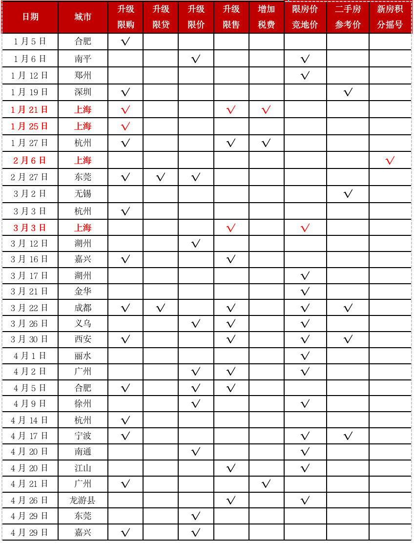 為落實穩(wěn)地價、穩(wěn)房價、穩(wěn)預(yù)期目標,合肥、深圳、東莞、成都等近30城相繼升級調(diào)控,并“下沉”到衢州下轄的江山市、龍游縣這類熱點縣市,重點涉及升級限購、升級限貸、升級限價、升級限售、增加房地產(chǎn)交易稅費、設(shè)立二手房參考價格、新房積分搖號等內(nèi)容。其中,上海連番6次政策加碼,嚴堵政策監(jiān)管漏洞,堪稱本輪房地產(chǎn)調(diào)控的風向標。